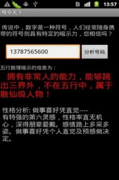 “号令天下” 是一款手机幸运号码预测工具(Cell Phone Lucky Number Analysis Tools) ,因其算法前瞻、测算准确、预测灵验、口碑相传,风靡全球。包括台湾、香港、日本、韩国、东南亚及欧美等地区拥有众多忠实用户,实为民间大众居家旅行、茶余饭后、无聊闲暇之娱乐占卜消闲测算游戏。因此结果无论吉凶,测试者不必当真,否则请勿使用。