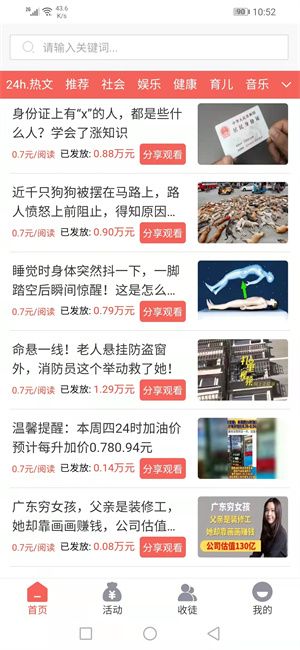 1、上面拥有社会、娱乐、健康、育儿、音乐、汽车等多种类型的文章资讯,更有24小时热文供你选择;
