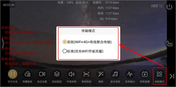 4、进入直播页,点击【传输模式】也可设置传输模式(默认选择“高效”,可手动修改为“标准”);