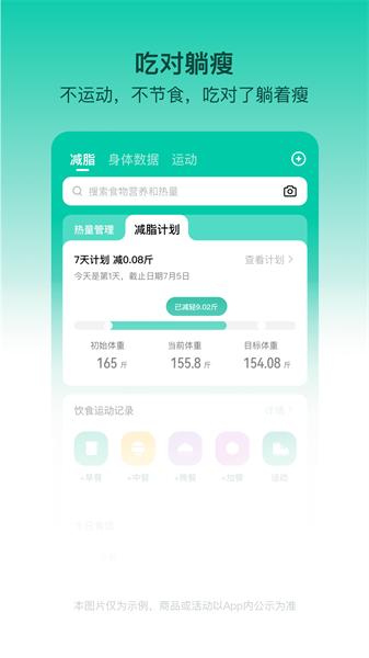2、独创热量管理减肥法,致力于探寻科学高效的减肥方法,帮助您计算食物热量卡路里(kcal),控制热量摄入及消耗,建立既能减肥又不忍饥挨饿的健康饮食习惯;