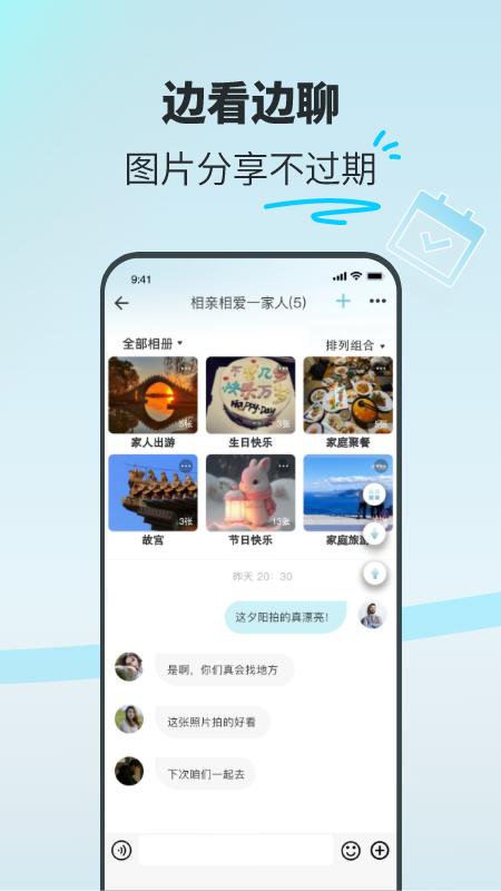 在享图与亲朋好友共享照片和视频,免去了互相传图和分类不便的麻烦,同时支持多人上传和预览,可评论、点赞、在线聊天以及随时随地和亲友分享互动,所有上传内容云端安全存储且上传的内容只有你想分享的人才能看见,安全放心。