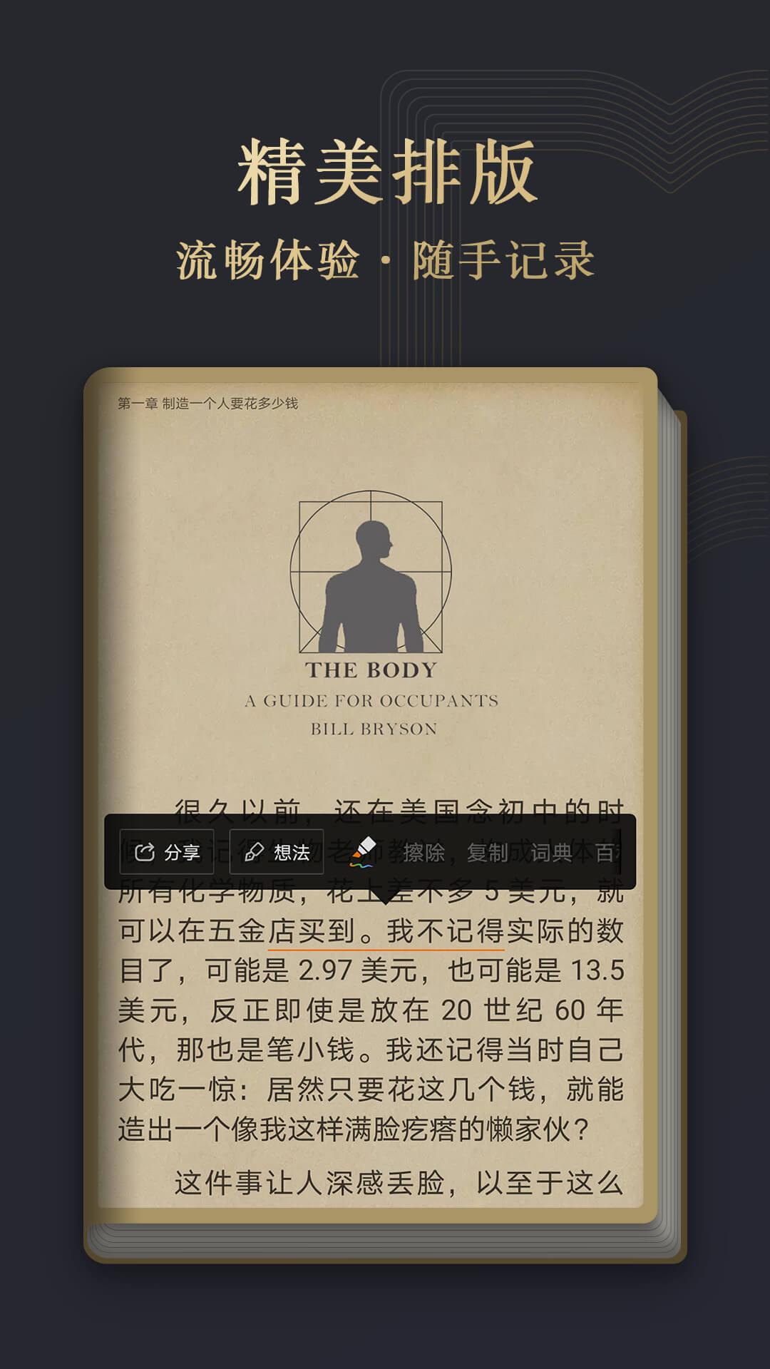 【沉浸式阅读体验】精选字体混排,支持阅读批注、记录笔记;字体、间距等细节都可以用户自定义;支持护眼模式,减轻眼睛负担;