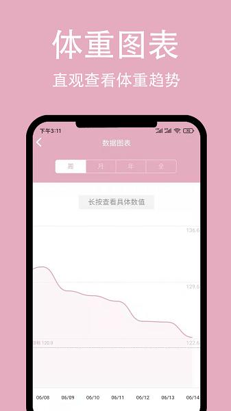 5.体重列表、柱形图、趋势线、百分比圆环等多种方式为您展示瘦身进展