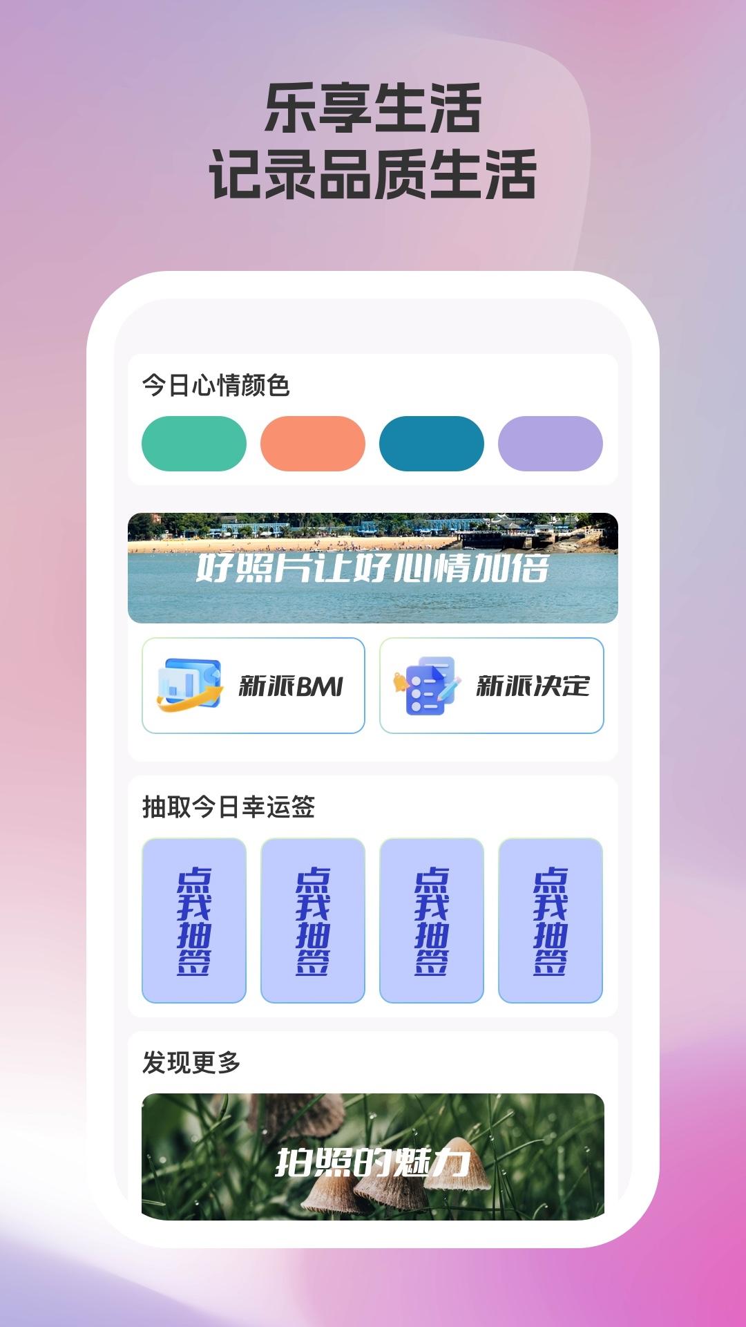 新派相机app是一款能帮助用户轻松留存美好画面的拍摄软件,简单易用的相机功能,在应用中不仅能拍摄记录,还能帮助用户焕发青春,让自己更加轻松愉快的生活;诸多精美的背景图片,可自行在应用中进行更换,帮助用户不用到现场也能感受到现场的氛围,清晰明了的呈现精美风格,并且可以详细欣赏照片的细节,了解自己的图片内容更全面;新派相机免费版软件还为用户提供了幸运抽签以及新派决定等工具,可自由在应用中体验,帮助用户每天都能拥有好运签,还能快速做决定;有兴趣的伙伴即刻在线下载这款手机应用体验吧!