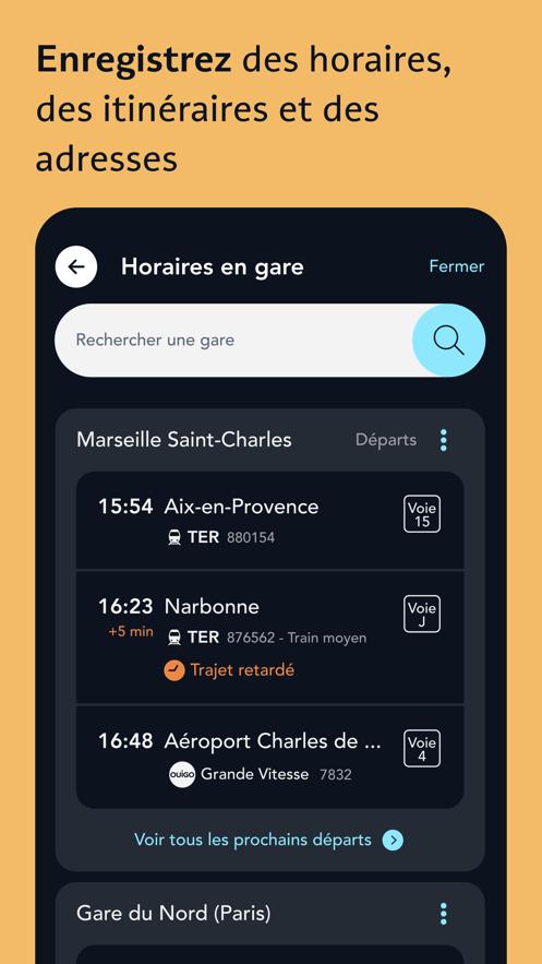 - 在旅途中实时查询交通信息和火车位置,并在发生中断或工作时接收警报,包括欧洲之星(前大力士高速列车)、TGV Lyria 等)