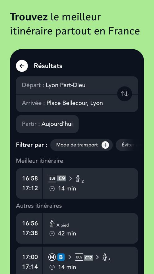 - 查找所有您喜爱的交通方式:巴黎和法兰西岛的公共交通(IDFM 网络)以及法国 29 个城市的公共交通(地铁、巴士、有轨电车、RER、Transilien SNCF、RATP)、火车(TER、Intercités、 TGV INOUI、OUIGO Grande Vitesse 和经典列车、TGV Lyria、欧洲之星(前 Thalys)、DB SNCF Voyageurs...)、长途汽车(Flixbus、Blablacar 巴士)和拼车(Blablacar)