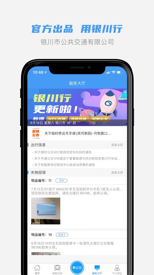 “银川行”是银川市官方出品,是致力于为用户提供精准的出行信息服务,包括但不限于公交线路查询、扫码乘车、实体卡充值、推荐乘坐线路、查看周边位置信息、定制公交、包车、驾驶培训介绍、旅游行程服务、出行公示信息、失物招领信息等服务,为用户在本市区域内的出行提供全方位、立体式、有温度的出行服务。