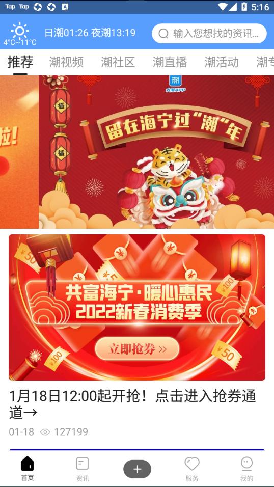 大潮app是专为海宁市制作的一款融媒体移动平台,平台拥有新闻资讯,视听,服务等等功能内容,是引导及服务海宁市的掌上好帮手。