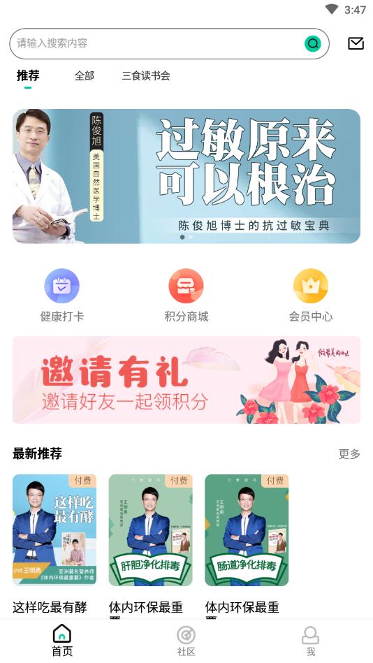 三食读书会app是一款阅读交流会议软件,用户可以在软件上分享和交流他们的经验,软件拥有海量健康书籍,让用户随时随地上软件学习,有很多健康专家供用户科普,可靠的健康资讯,传播正确的健康理念。