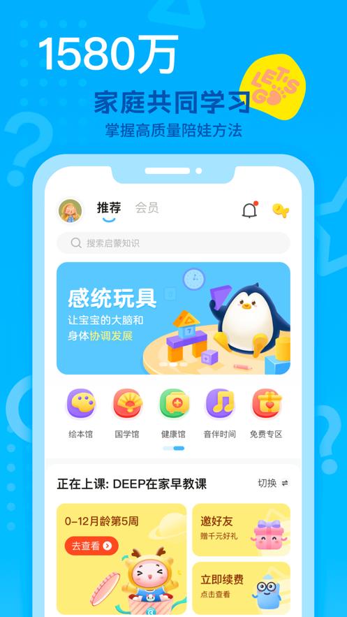 ·DEEP早教课——DEEP即Dynamic Early Education from Palo-Alto,来自硅谷充满活力的早教方案,以此为基础由斯坦福、清华、Google等知名教育研究者合作开发,适用于6月-3岁宝宝的在家早教课程。课程皆为真人视频教学,融合40多个学科、涵盖135个递进主题、包含1000多种开放式教具,更有1000句常用英语融入互动,针对宝宝3岁前的5个敏感期进行综合的锻炼。系统会根据宝宝月龄,分阶段推送课程,家长在家每天只需要20分钟,即可完成早教。