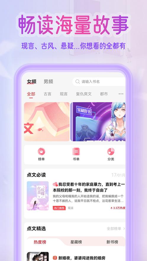 点文小说app是一款手机小说阅读平台,平台拥有丰富的小说资源,拥有个性化推荐,更新速度快,还可以离线缓存,可以给予用户超棒的小说阅读体验。