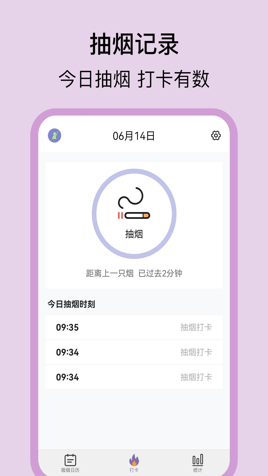 【抽烟记录】:只需在每次抽烟时点击打卡,就会帮您累计抽烟数量,计算吸入焦油量以及报告每天的吸烟状况。