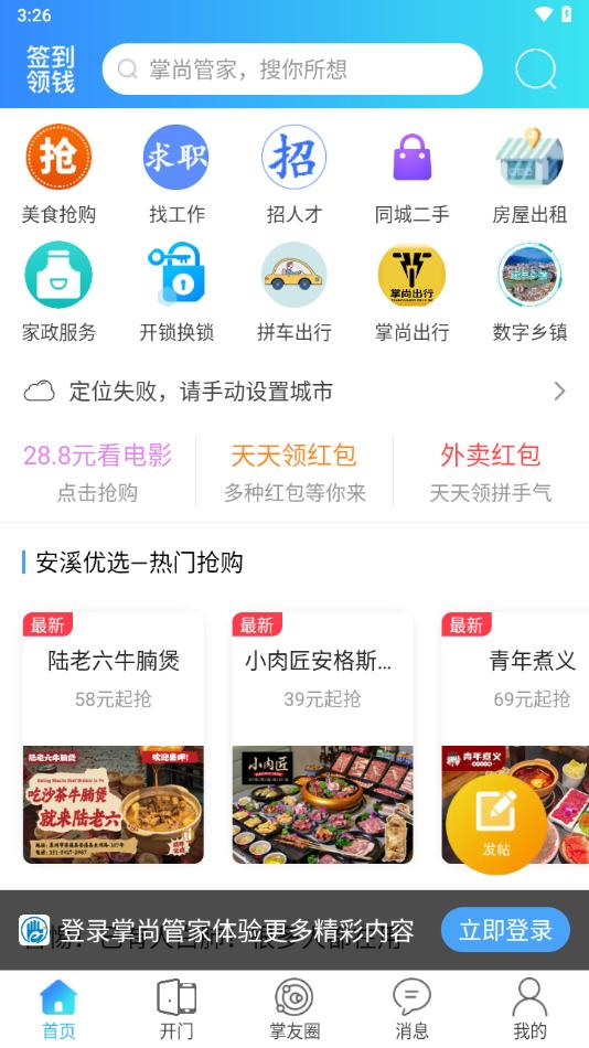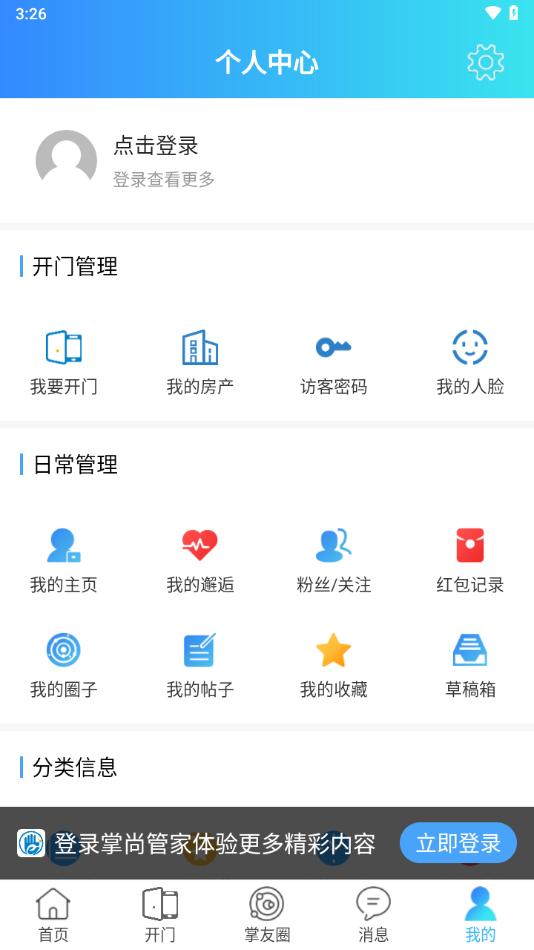 掌尚管家下载是一款生活服务平台,平台拥有首页,开门,掌友圈,消息,我的等功能板块,可以帮助用户更智慧便捷生活,觉得不错的朋友欢迎前来下载使用。