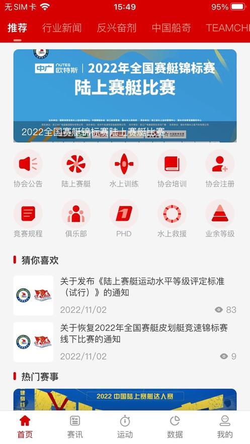 中国划船app是专为水上运动爱好者制作,软件拥有首页,赛讯,运动,数据,我的等等功能板块,可以帮助提供更好的划船服务,喜欢划船的朋友可千万不要错过。