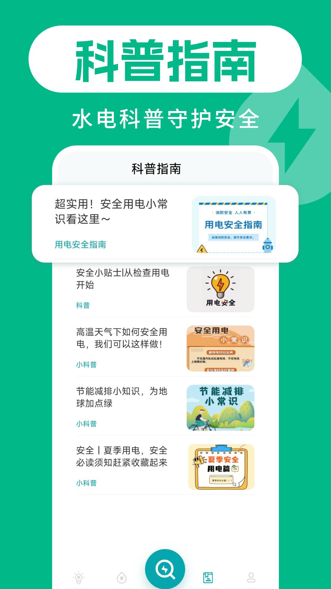 应用内包含丰富的水电使用知识和节能小贴士,帮助用户了解如何节约用水用电,提高能源使用效率,同时普及水电安全知识。