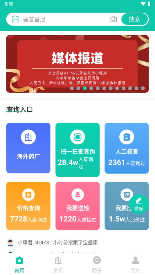 圈子:为用户提供发布评论、回复帖子、了解最新药品上市信息、治疗资讯,及健康资讯
