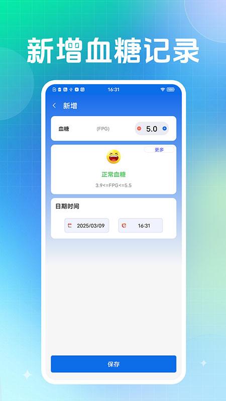 在应用中就能实现血糖健康数据记录,保存每一次监测的信息,便于查看分析;