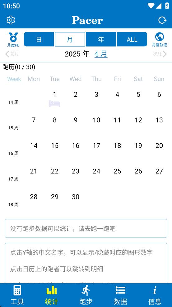 ・可按照日/月/年来统计,跑量图/时间图/配速曲线/心率曲线/心率区间图/配速区间分布饼图/GPS轨迹累积图/各种PB统计/跑步日历