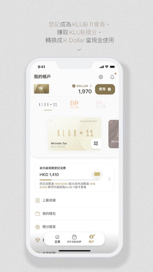 管理KLUB 11 会员帐户,登记及查阅KLUB 积分,转换成K Dollar 于K11 集团旗下商户当现金使用。