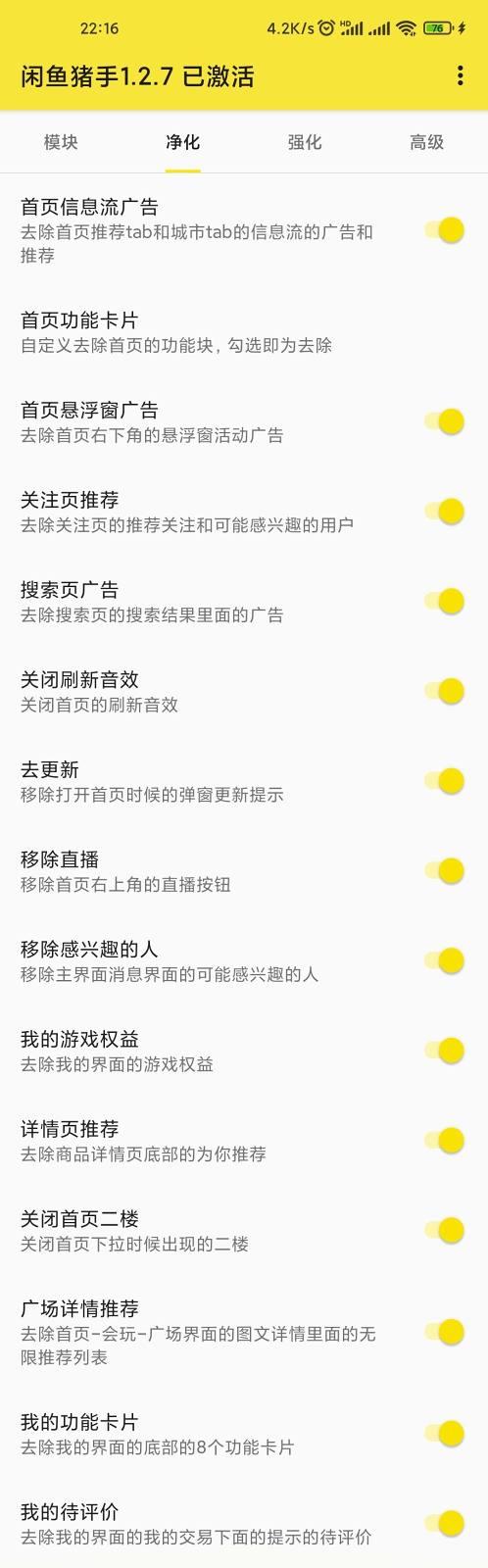 闲鱼猪手是一款专门为闲鱼客户端开发出来的软件,如果您使用闲鱼的情况多的话,那么很适合拥有这款插件,它可以清除广告,隐藏您觉得多余的内容,让您的闲鱼功能更加的全面丰富,界面也会更加的简洁;