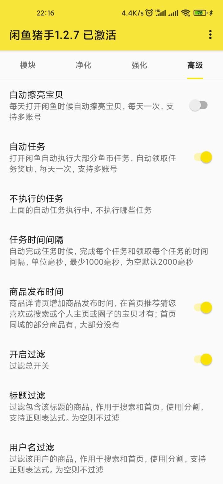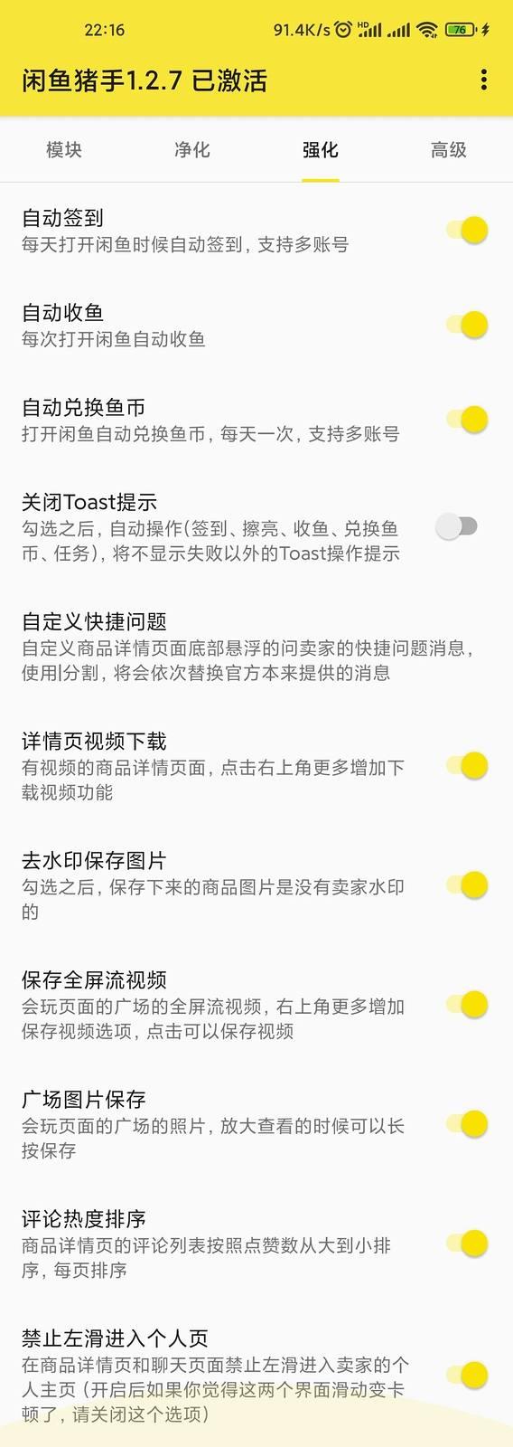 闲鱼猪手app是一款专为咸鱼软件打造的非常好用的辅助应用工具,该软件可以自动报到、进入挂起的窗口广告、关闭刷新音效、删除打开的屏幕广告等,让用户在使用咸鱼软件时更加清爽。