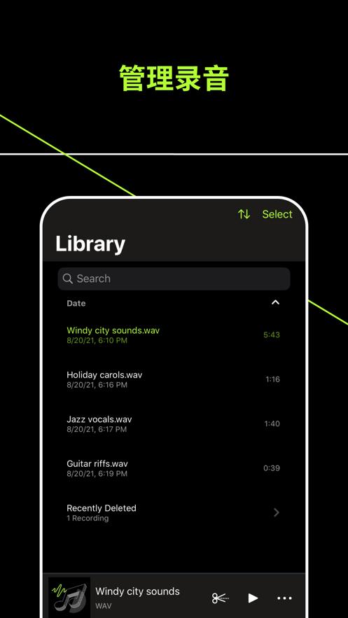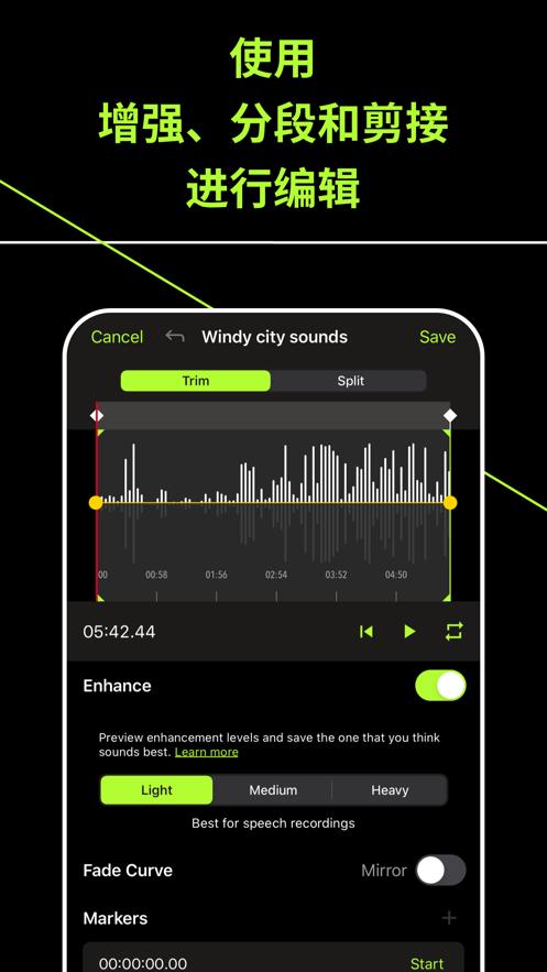 ★ 使用修剪或拆分选项(包括可调节淡出曲线和标记)编辑录制文件