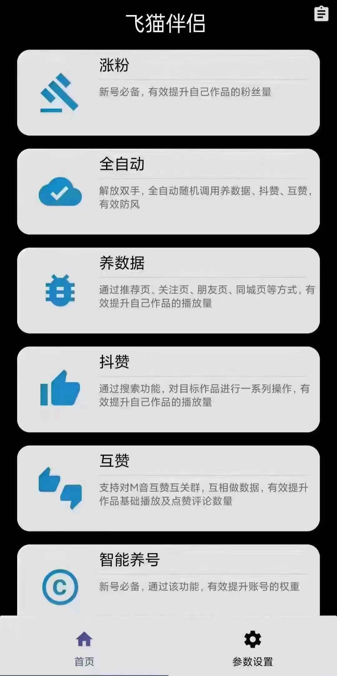 飞猫伴侣app是一款专门为自媒体工作者开发的多功能拓客涨粉神器,能够模拟人工对作品进行点赞、关注或评论,为作品增加人气,能够对视频作品进行搜索和筛选,帮助自媒体人员轻松养号。