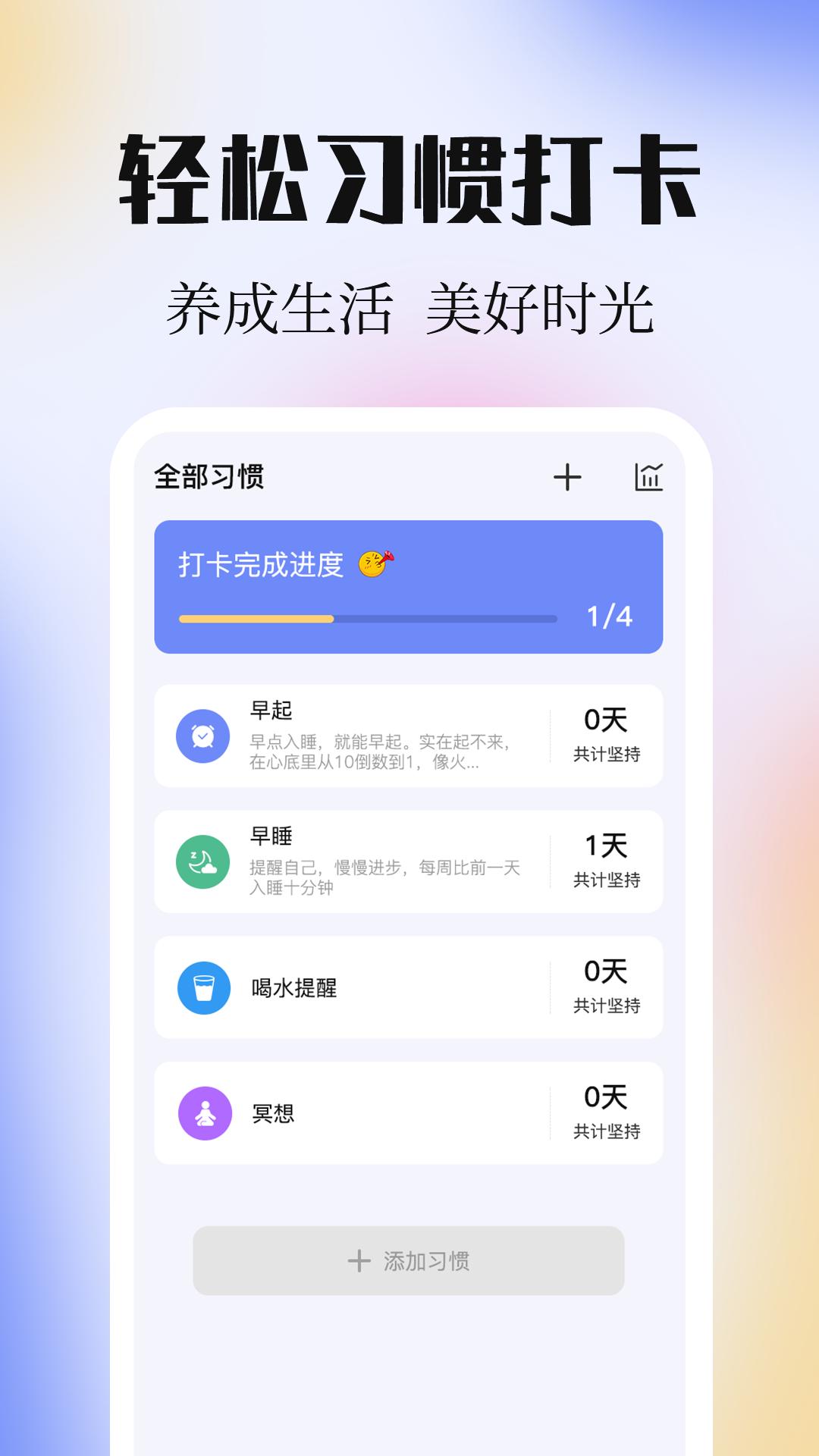 帮助用户养成良好的生活习惯,助力用户开启自律的生活体验,即可养成好习惯。