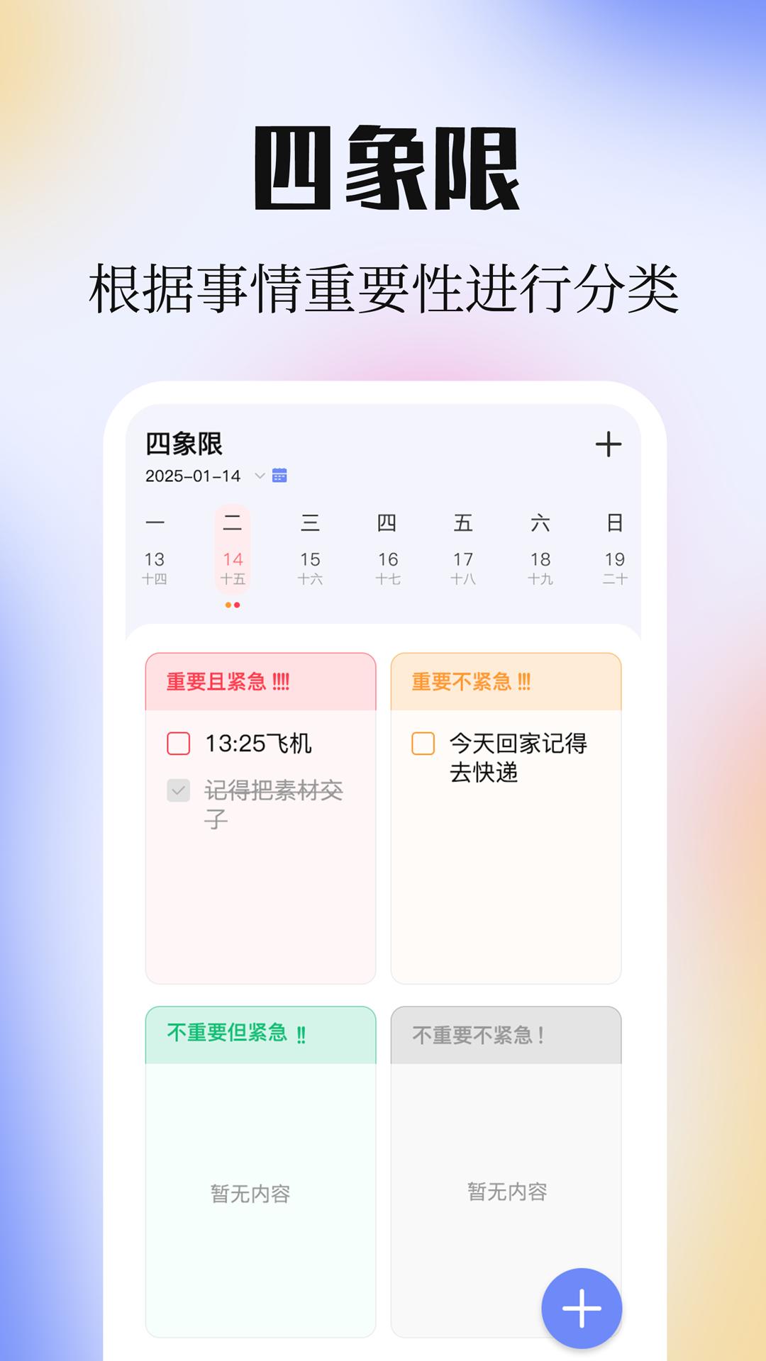 计划ToDoList清单app是一款为用户提供日程计划清单管理的应用软件,软件支持用户轻松管理日程计划,这里为用户提供了专属的时间计划舱,清晰查看待办事项,对其可以四象限分类的管理,便捷排序需要的时间顺序,从而可以拆分任务,快捷的完成日程计划,高效的生活和办公。平台还支持用户可以查看清晰的日历视图,就可以让你在日历视图中查看相关的事项,对其全局查看,便捷的安排时间。此外,计划ToDoList清单官网版还支持用户打卡良好的习惯,记录自己的习惯任务,清晰查看打卡完成的进度,有需要的用户就赶紧来本站下载使用吧!
