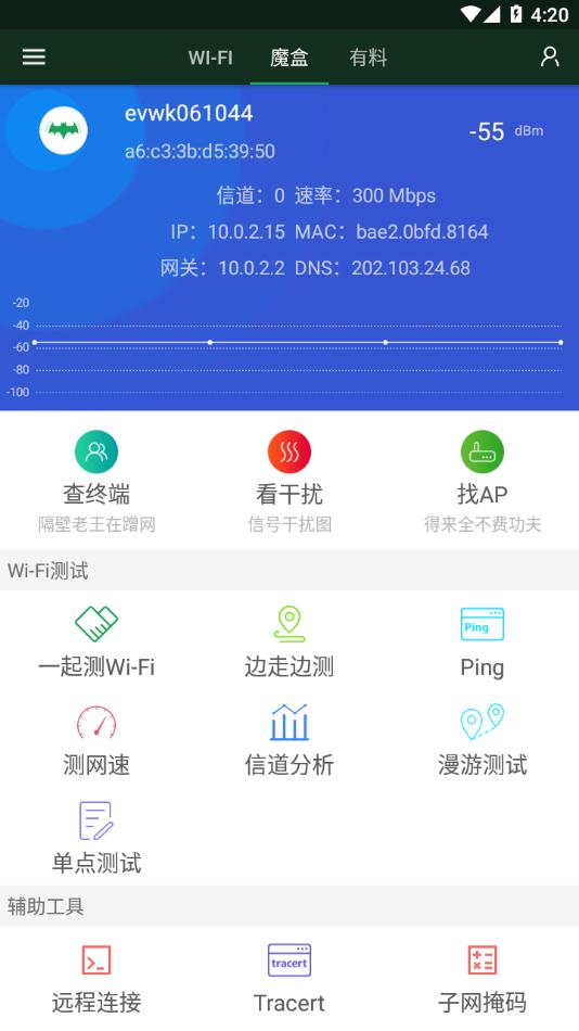 集成网络专业工具,漫游测试、ping、测网速、telnet、蓝牙遥控,你想要的应有尽有。