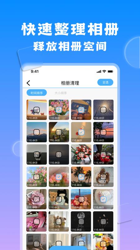 3、进行相册多样化排序,方便找到不需要的照片,并能一键勾选清理;