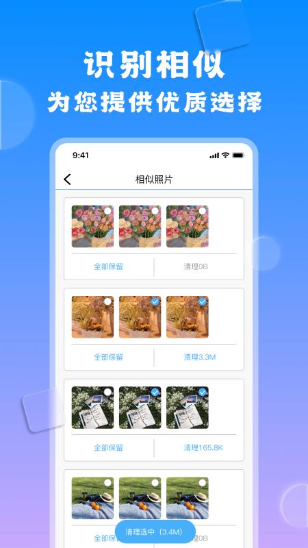 2、智能识别相似照片,帮助用户发现诸多相同的照片,便于一键清理;
