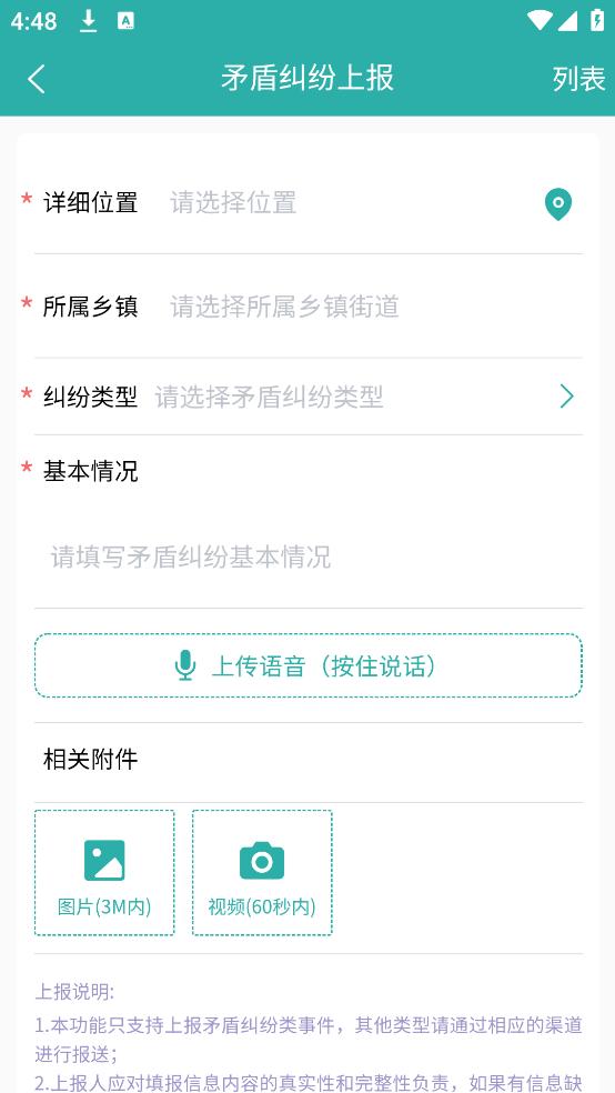 在矛盾纠纷上报将具体需要上报的信息进行阐述,选择正确位置以及所属乡镇,上传图片和视频能让上报内容更全面