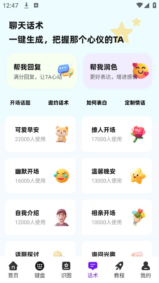 撩人输入法软件是一款让你撩人而不自知的手机输入打字工具,其实就是一个输入法软件,在这款软件中不仅可以满足用户对于日常生活中的打字需求,还可以对于用户的一些话术是提供的模板的,老是被说说话太直?这款软件中的多种模板就能教你如果高情商回复。
