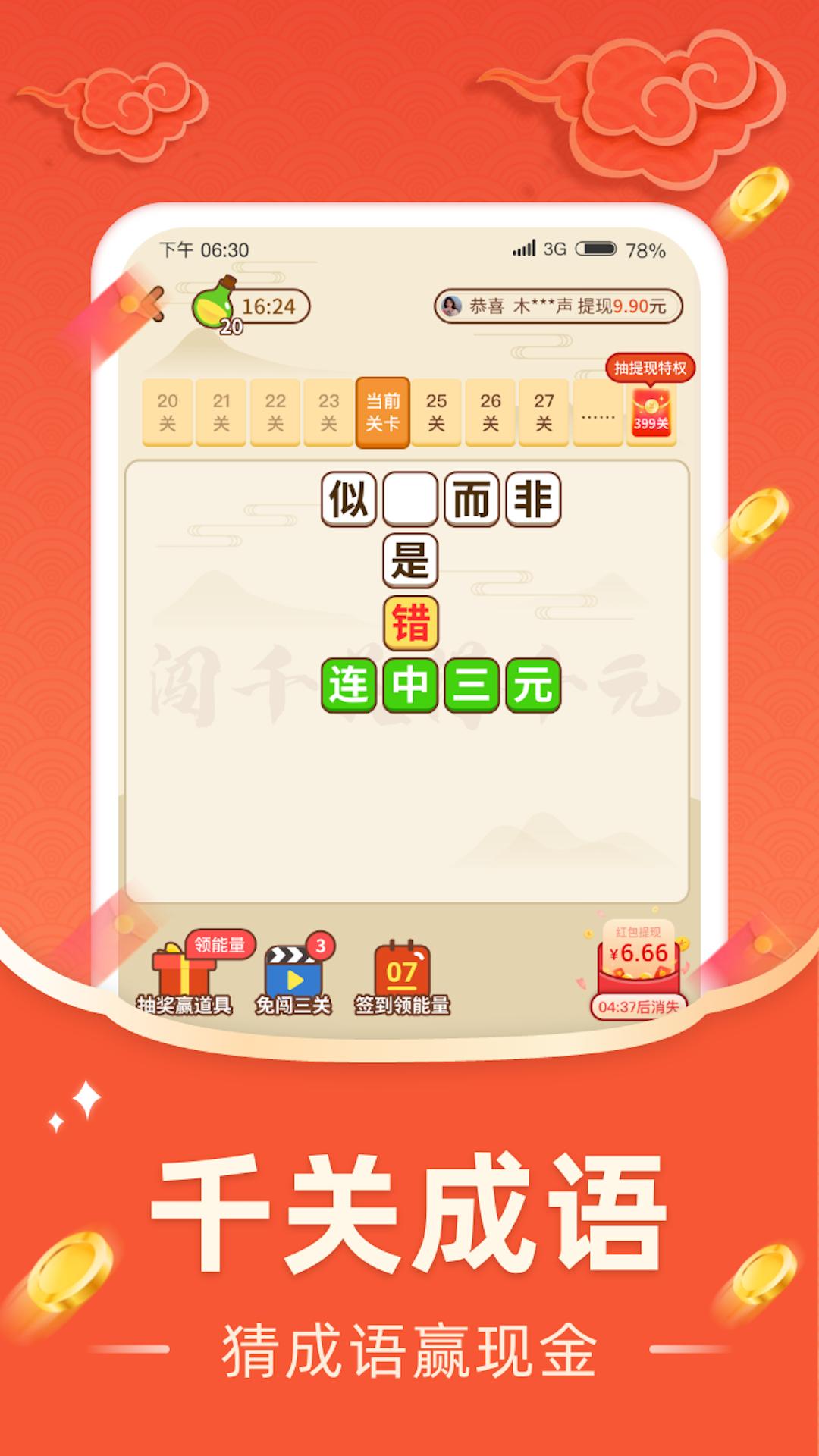 成语有宝是一款轻松休闲、趣味十足的休闲娱乐软件,经典熟悉的玩法,易上手,打开就会玩,闯关就能拿红包,关卡过得越多,奖励越丰厚,参加答题终极挑战,还能获得千元大奖,喜欢的朋友快来下载吧~