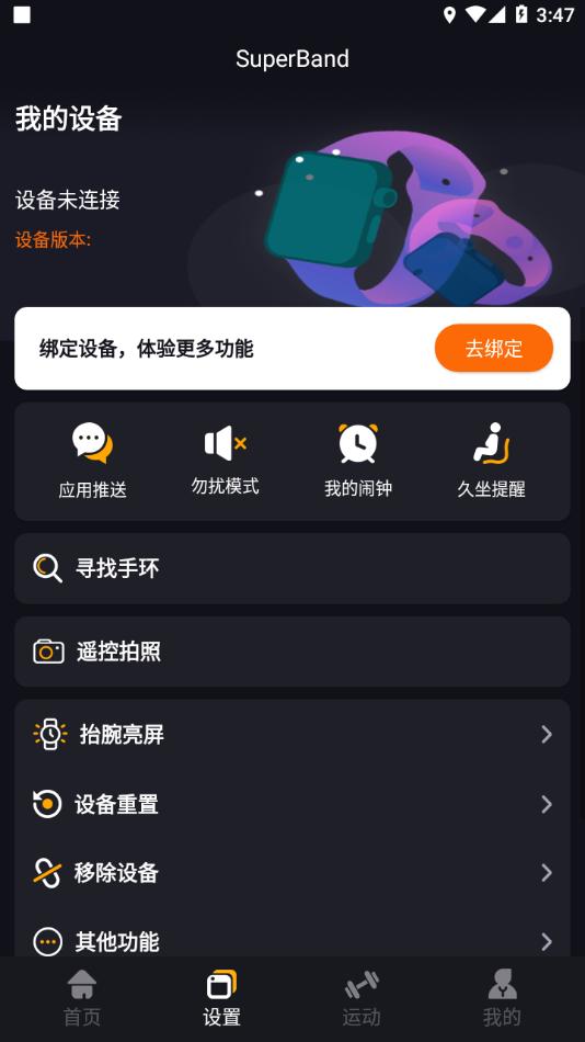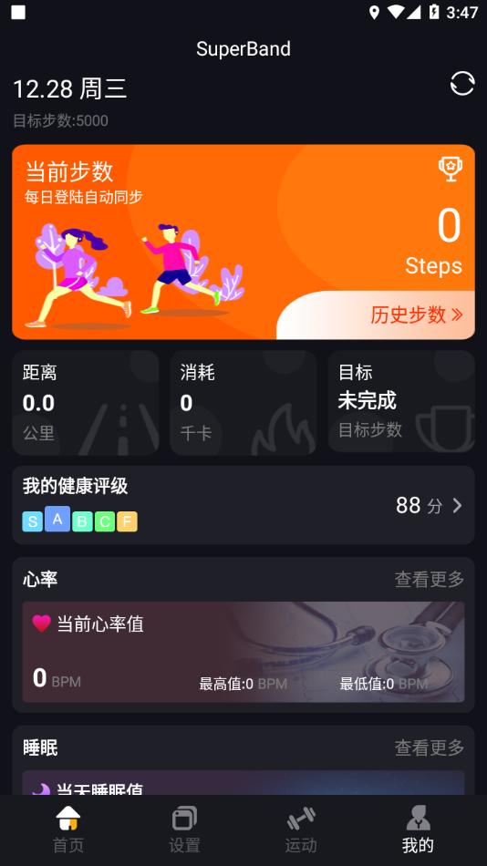 SuperBand超级手环app下载是一款智能手环手机配套应用,软件可以帮助用户手机连接手环,实现统计睡眠,测量血压,闹钟设置,计步,消息推送等等功能服务,需要的朋友欢迎前来下载使用。