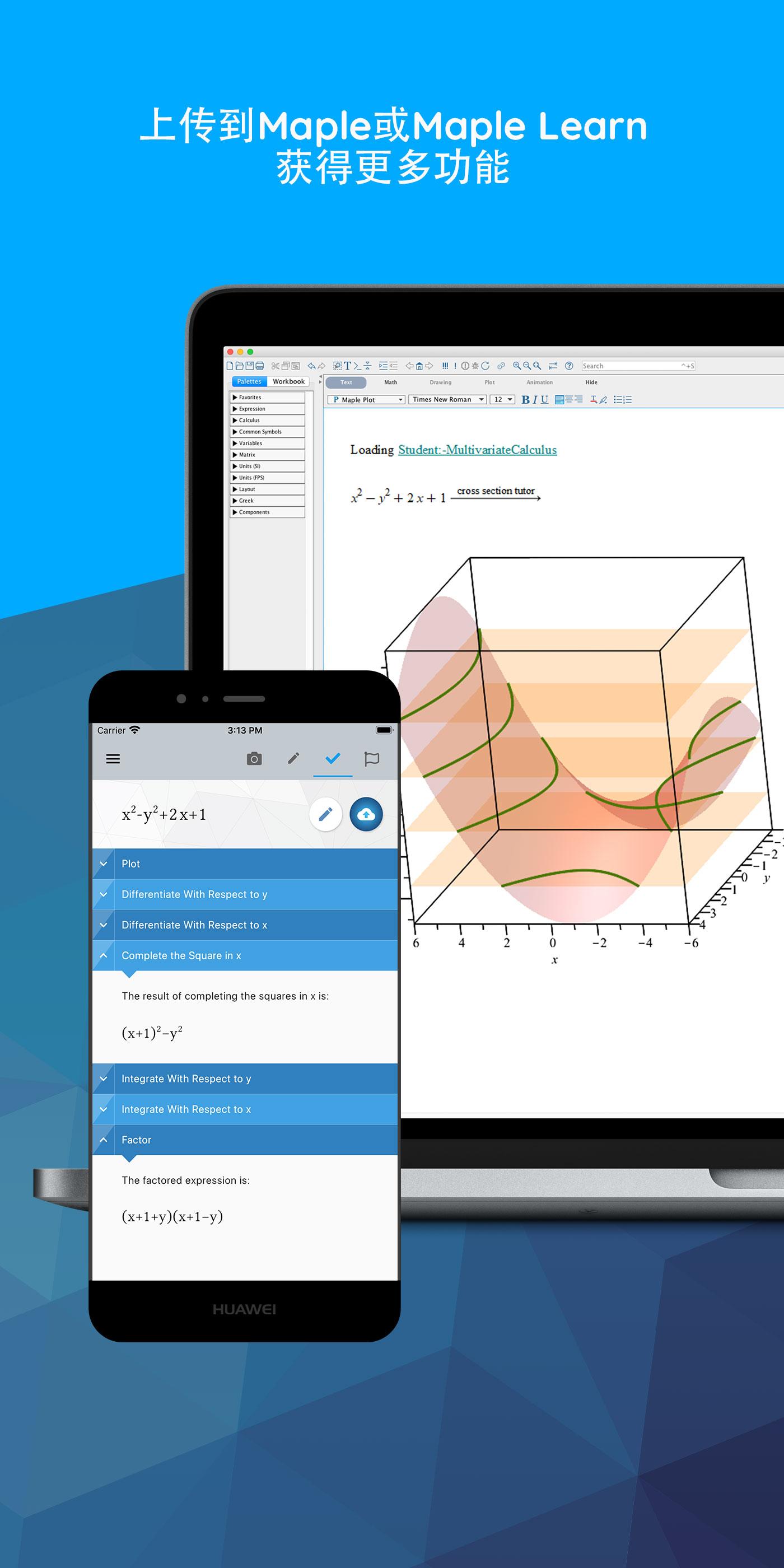 • 避免在使用Maple桌面版时的转写错误:避免在向Maple转写数学表达式时可能出现的错误,使用应用拍照并将结果上传至Maple,即可进行进一步探究和可视化。