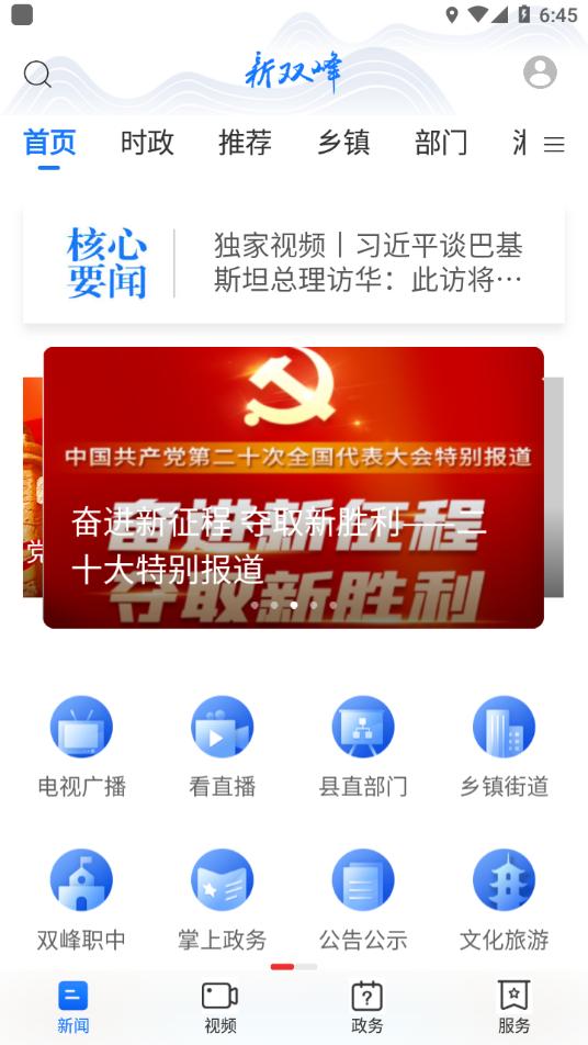 涵盖本地新闻、国内外资讯、党建、文化、旅游、电视、广播、直播、文明实践、便民服务、在线问政等内容,是宣传展示双峰的全新平台。