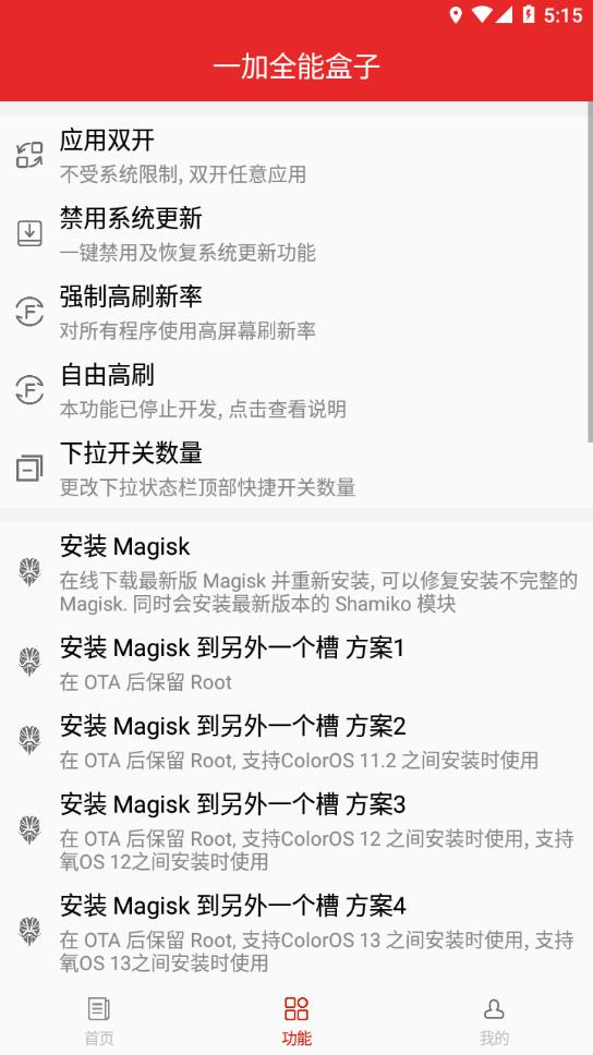 一加全能盒子app是一款系统工具,软件拥有一加无限制双开,强制高刷新率,修改下拉开关数量,内测固件洗白等等丰富功能,需要的朋友可以前来下载使用。