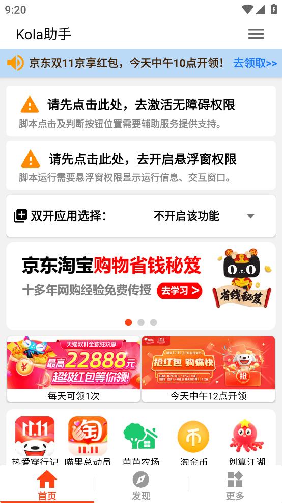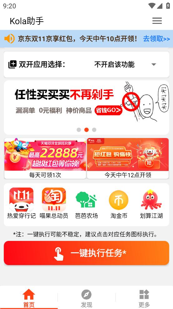 kola京东淘宝助手app是一款专门为京东淘宝双11打造的刷做任务软件,通过点击开始执行,就能够立即跳转到活动页面,它完全不需要您手动操作。它可以自动完成任务,例如浏览商店、跟踪商店等。它可以完成一系列任务,自动从活动中获得奖励,并通过自动化自动完成和接收奖励。