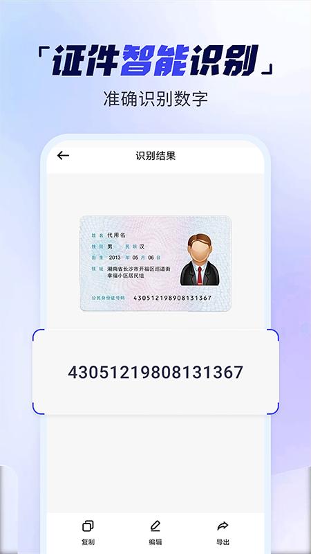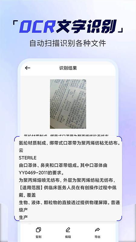 【文字识别】通过OCR文字识别技术自动扫描识别各种文件,图片,卡片并提取出想要的文字,可对识别内容进行编辑,扫描内容支持多种格式导出。