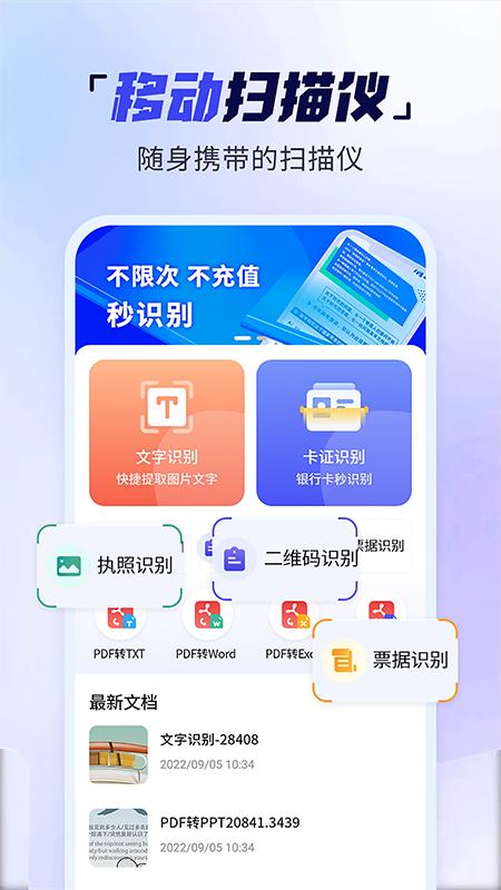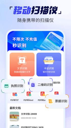 手机扫描多能王是一款功能强大的扫描工具:文字识别、卡证识别、表格识别、票据识别、PDF转Word、PDF转EXCEL、PDF转PPT等日常所需功能都能在上面找到,是你的移动多功能扫描仪。