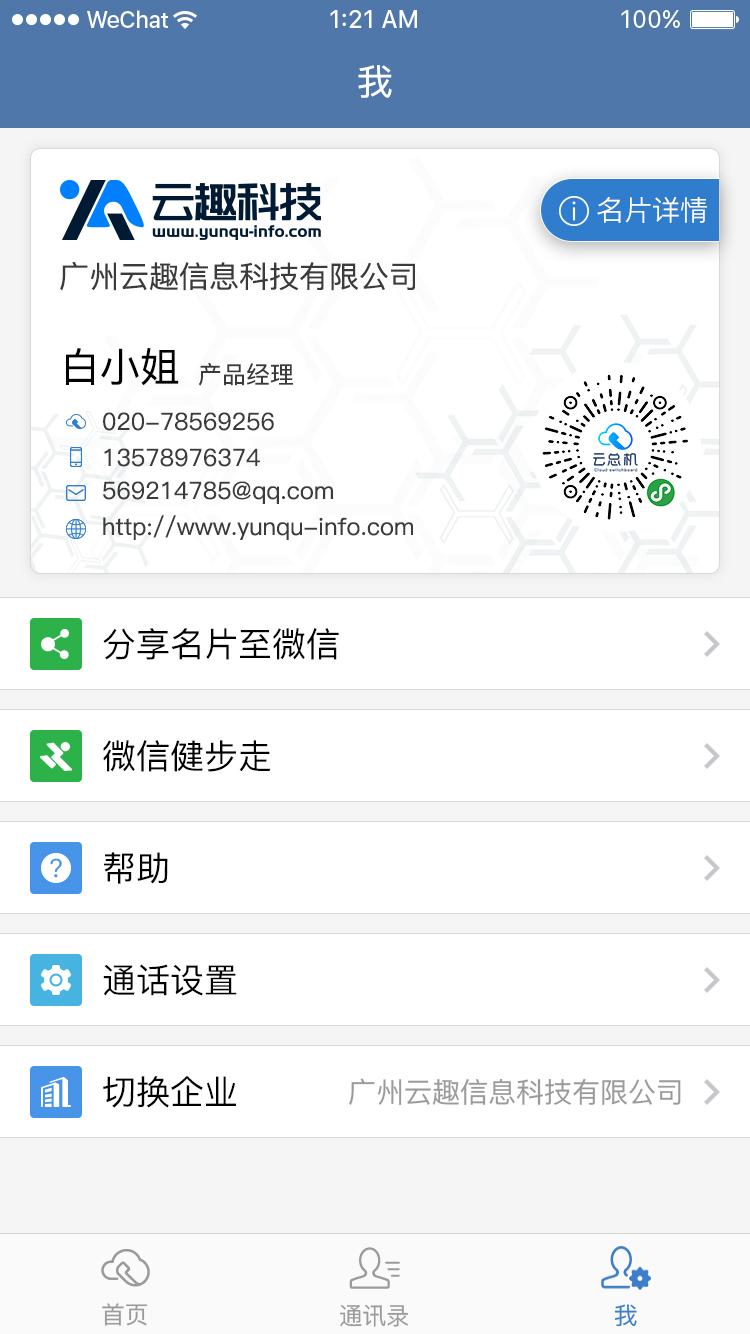 拥有丰富的个人主页设置功能列表,比如名片分享、微信健步走以及帮助和通话设置等;