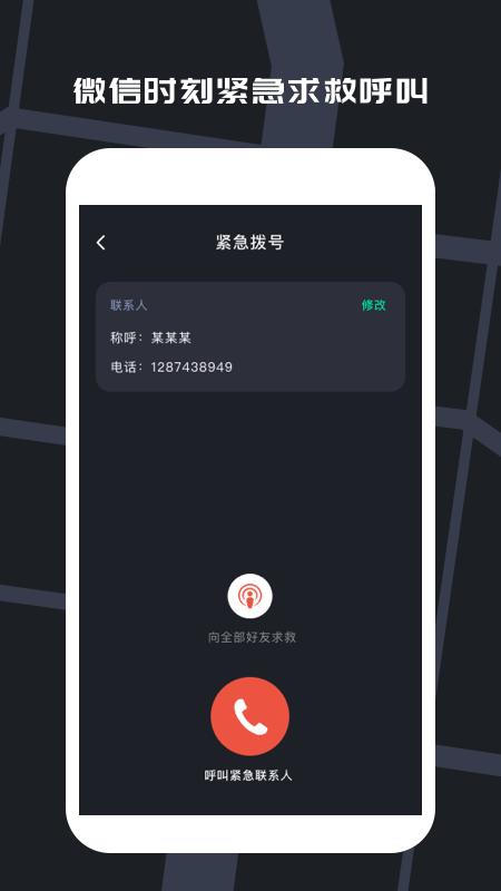 1、紧急定位:手机号定位、微信定位、QQ定位,类似于滴滴紧急联系人位置分享;