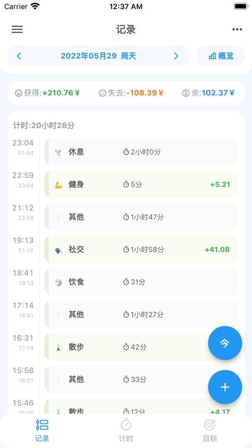 时间就是金钱。每一次记录时间都会和你的填写的收入挂钩,会根据记录的时间性质和时间长短增加或消耗。