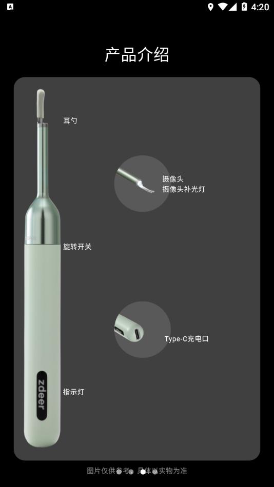 智能采耳仪为耳镜方面的工具类应用,通过wifi与采耳仪设备链接,可以在移动设备上显示镜头的实时画面。