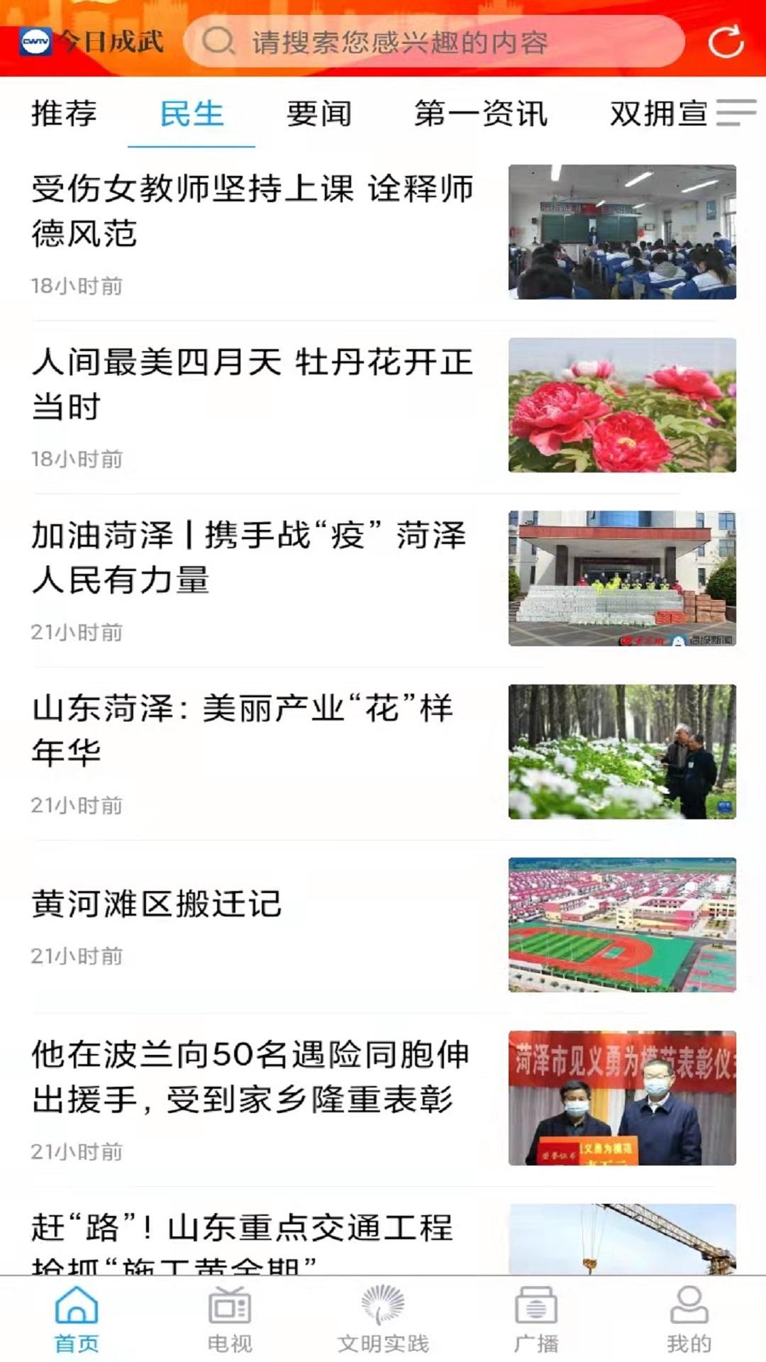 《今日成武》是成武县融媒体中心倾力打造的互联网移动客户端。开设看电视、听广播、现场直播、成武 文艺、文明实践、政务号、同城等多个特色栏目,提 供成武综合频道、成武综艺频道和FM103.1成武之声同 步直播以及电视栏目在线点播。客户端对本地资讯、 民生热点进行实时报道,传递来自现场的主流声音。