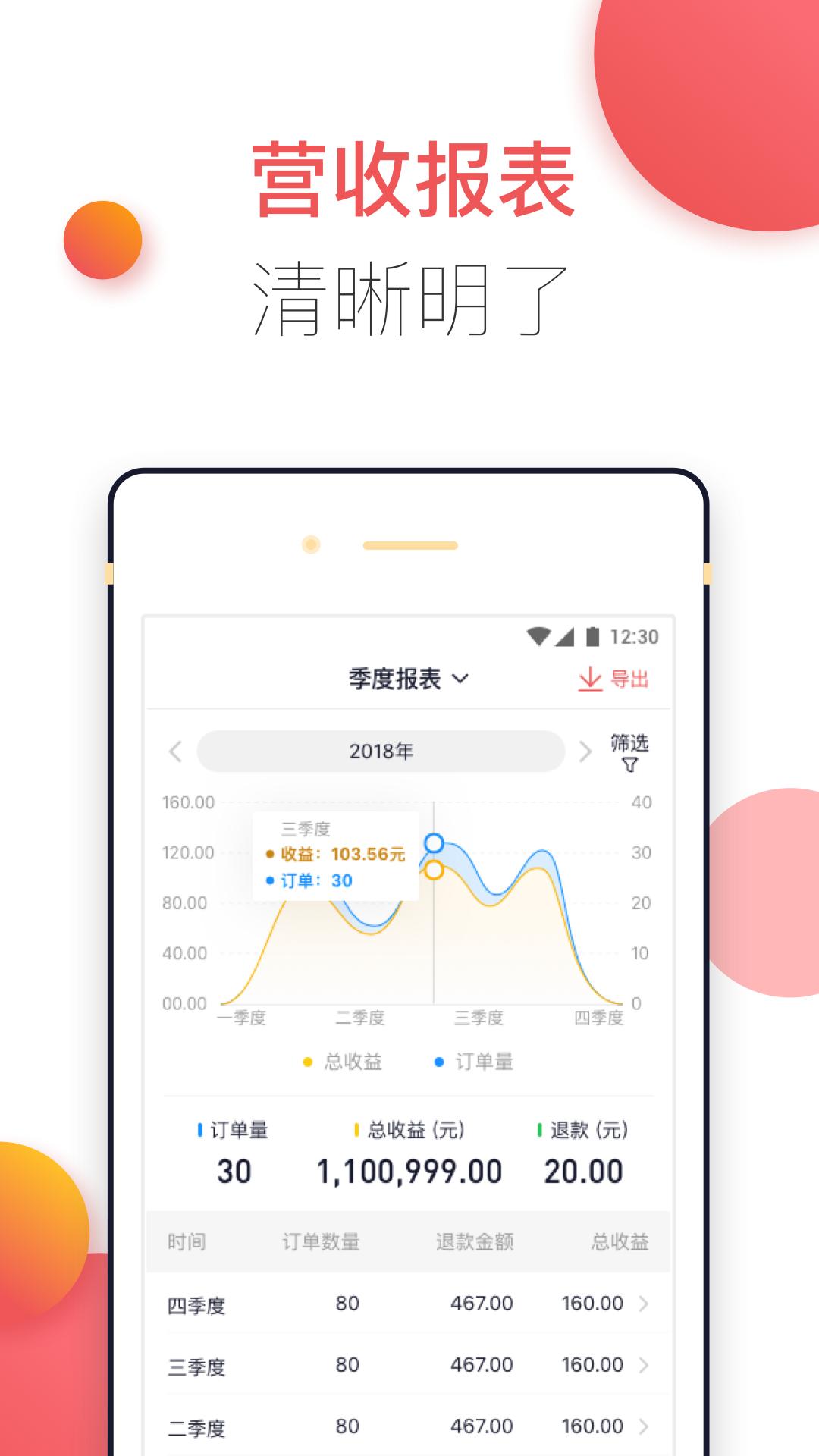1、数据报表在线看,为用户提供了详细的报表内容,能够让用户对于自己的营收做到一目了然,多种的显示效果,清楚的显示出了各个季度的收益情况.