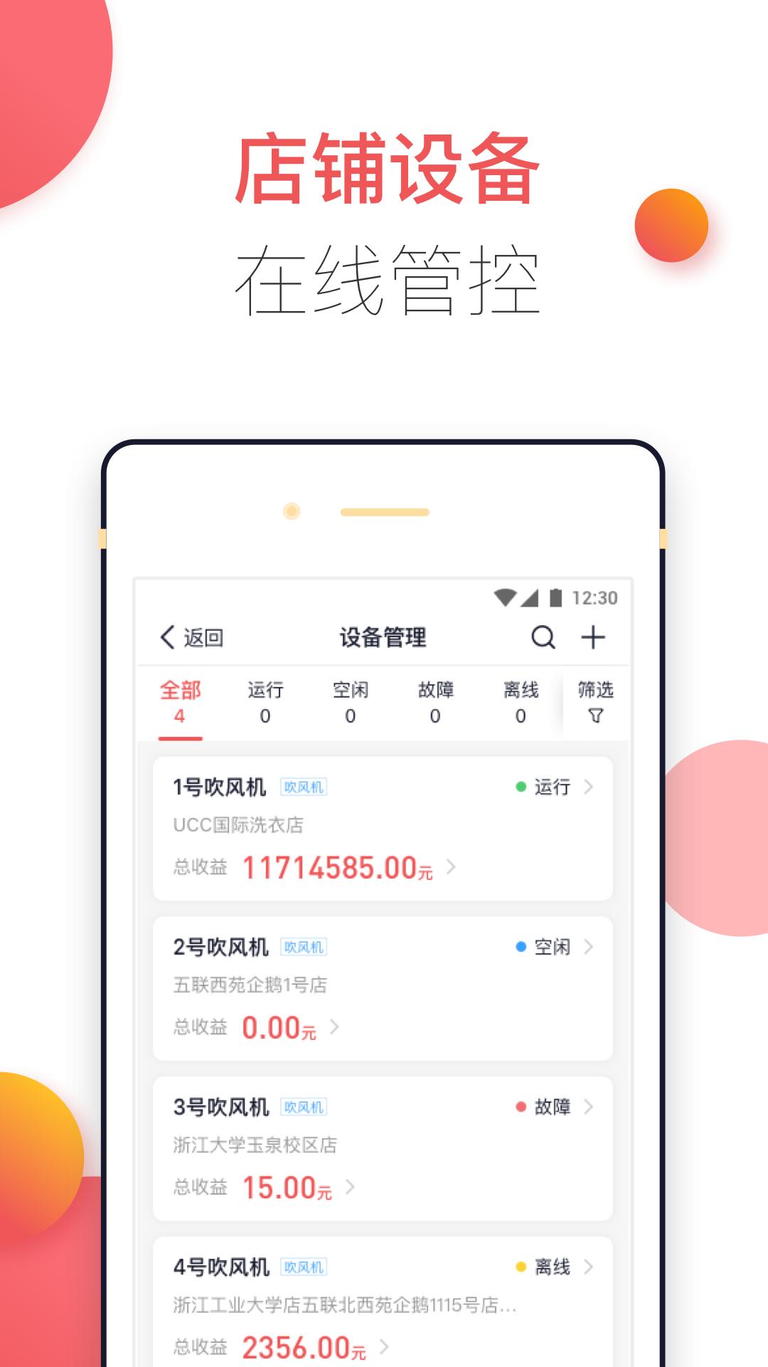 2、设备在线管理,用户可以在线管理自己店铺里的多种设备,让您能够实时查看自己店铺设备的运行状态,包括了运行中、空闲、故障等多种的类型设备.