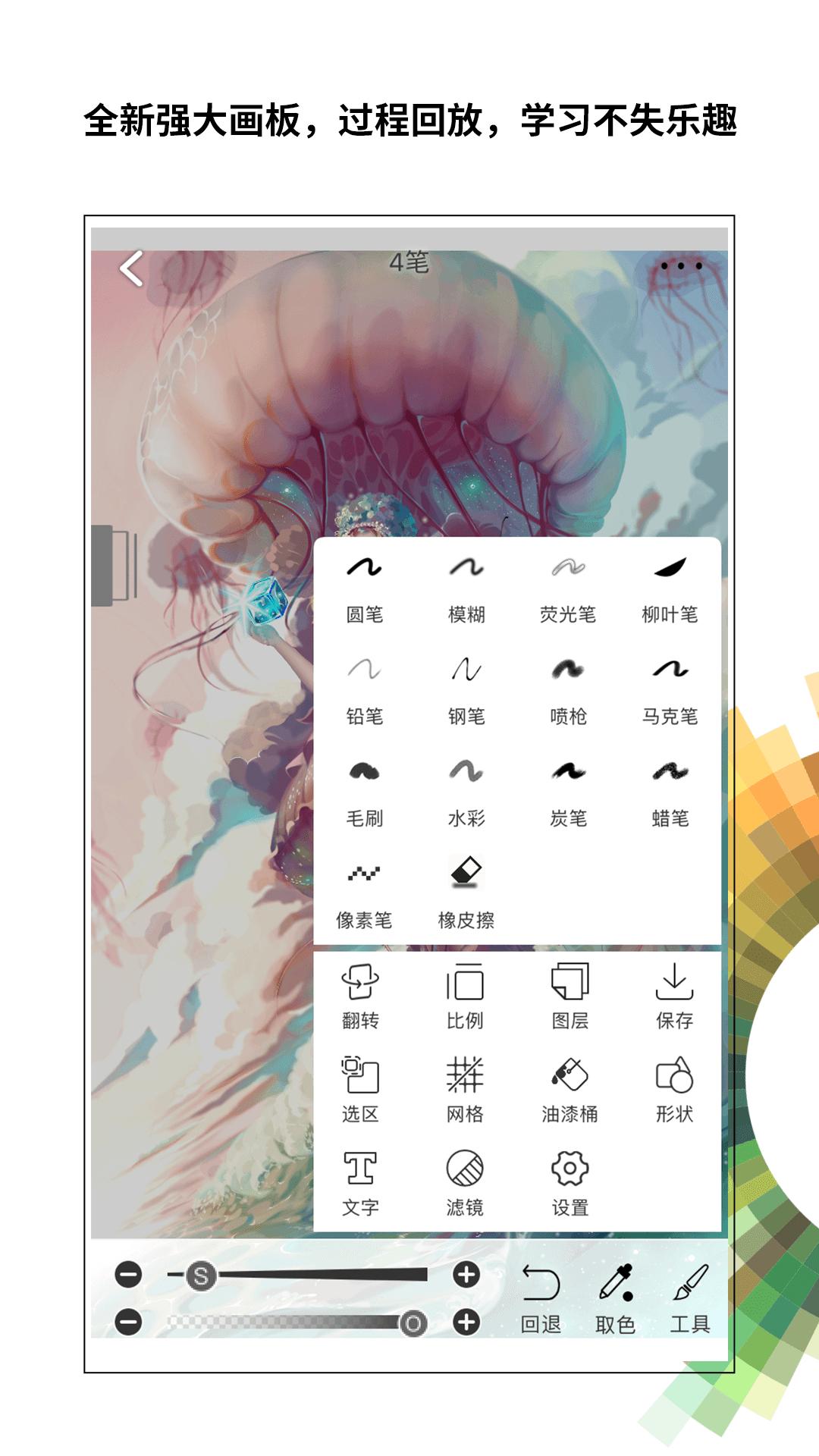 画吧是款超好玩的手机涂鸦社区,创作发表属于自己的绘画作品或者是漫画书,二次元、简笔画、素描、山水画、国画只要你喜欢你都可以画,铅笔、水笔、柳叶笔、水彩笔、等等,近二十种画笔任由用户选择,文字工具、滤镜、油漆桶等多种工具供用户调用,你也可以跟他们一起讨论,一起学习